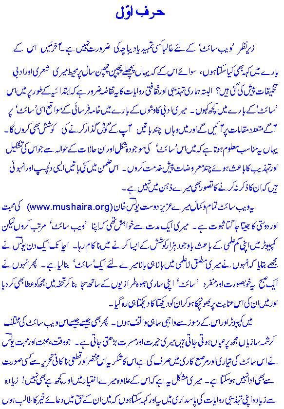 yeh web-site mere a'zeez dost Younus Khan (www.mushaira.org) kee muHabbat aur dost-nawaazee kaa jeetaa jaagtaa cuboot hai. unhoN ne meree laa-i'lmee meN baalaa hee baalaa yeh KhoobSoorat site apnee tamaam jalwah-t^araaziyoN ke saath` sajaa aur banaa kar ek din mujh` ko tuHfeh meN a't^aa kar diyaa aur maiN masarrat aur Hairat se dekh`taa kaa dekh`taa reh gayaa! maiN computer ke rumooz se Khaal-Khaal hee waaqif hooN likin jaise jaise is site kee muKhtalif karishmah-saaziyaaN mujh` par a'yaaN hotee jaatee haiN meree Hairat meN iZ^aafah hotaa jaataa hai aur Younus kee meHnat aur muHabbat kaa iHtiraam mere dil meN baRhtaa hee chalaa jaataa hai. maiN is teHreer se un kaa shukriyah adaa karnaa apnaa ek nihaayat Khush-gawaar farZ^ samajh`taa hooN aur un ke Haq meN dua'a-e-Khair kaa t^aalib hooN!