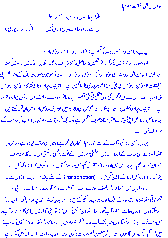 Urdu ke jawaaz meN kuch` kehnaa teHSeel-e-laaHaaSil hai. z^aahir hai keh maiN Urdu meN likh`taa hooN to meraa site bh`ee Urdu meN hee ho gaa! reh gayee Roman Urdu to internet kee Urdu meHfiloN kee maujhoodah Soorat ke pesh-e-naz^ar Roman meN likh`naa naa-guzeer hai. internet par Urdu kaa beshtar kaam Roman meN hee ho rahaa hai. is se un Urdu-dost logoN kee adabee tashaffee kaa saamaan muhayyaa hotaa hai jo yaa to Urdu se naa-waaqif haiN yaa jin kee Urdu kamzor hai.