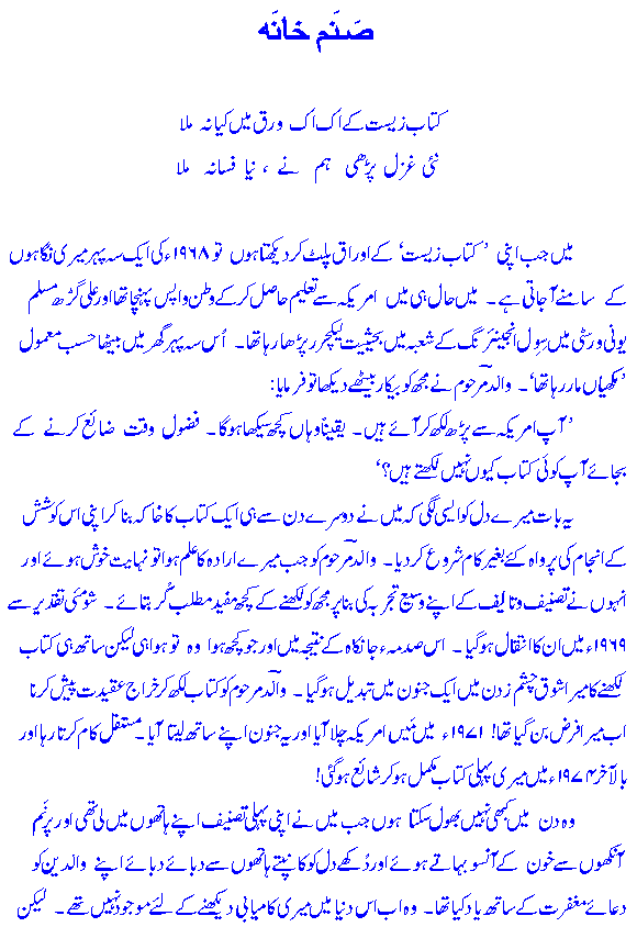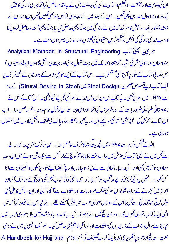 To date Sarwar Alam Raz has written nine books in Urdu and English on various subjects. The list given below reflects his wide-ranging interests in writing. Encompassing Civil Structural Engineering, Urdu poetry (Ghazal, nazm^, qit^a'at etc.), Afsaane (short stories), literary articles and Islaamiyaat, the list is interesting as well as intriguing. It is hoped that the visitor to this site will find something of his interest here! If only it were possible to reproduce Sarwar's text books on Structural Engineering! :-)