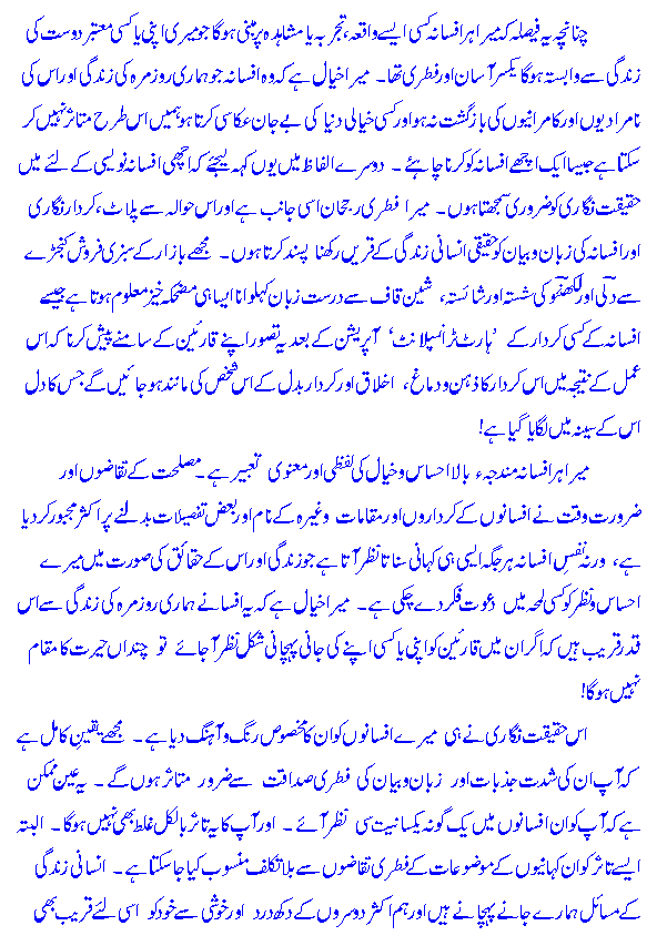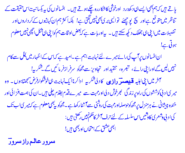 meree afsaanah-nigaaree kee taareeKh bohat muKhtaSar hai. kuch` hee a'rSah qabl ek risaale meN afsaane paRh`te huwe Khayaal aayaa keh kyoN nah maiN bh`ee is fan meN apnee qismat aazmaa,ooN! chunaan.ch apne Zaatee mushaahidaat aur tajribaat ko bunyaad banaa kar maiN ne afsaanoN kaa taanaa-baanaa bun,naa shuroo' kar diyaa aur nateejah aap ke saamne hai! in afsaanoN meN se har ek yaa to meree zindagee ke kisee Haadiceh se muta,a'lliq hai yaa kisee qareebee dost ke tajribe par mabnee hai. ummeed hai ke Haqeeqat-nigaaree ke aa,eenah-daar yeh afsaane aap ko pasand aaYeN ge. aap se iltimaas hai keh :KitaabeN: (Books) ke baab meN :Teesraa Haath: par likh`e gaYe deebaachoN ko paRh` leejiYe gaa taa.k in afsaanoN kaa pas-manz^ar aur takneek aap par mazeed z^aahir ho jaaYeN. shukriyah!